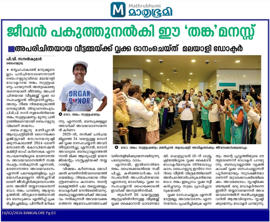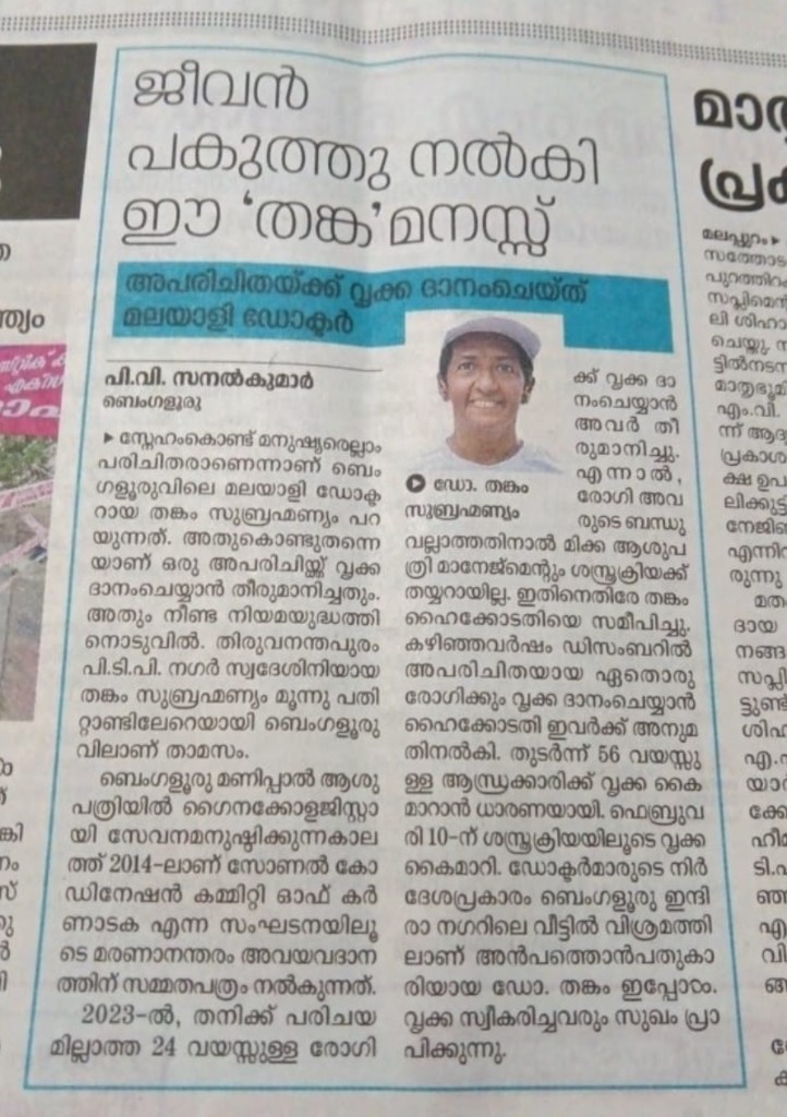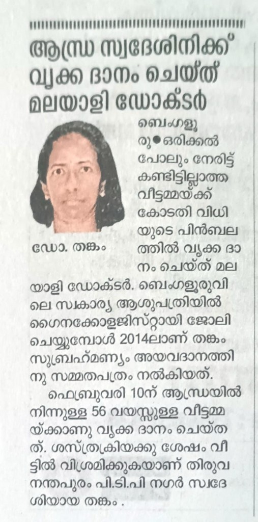 Dr. Thankam Subramonian, a native of Thiruvananthapuram, has become a noble example of humanitarianism after waging and winning a legal battle to donate an organ to someone not related by blood.